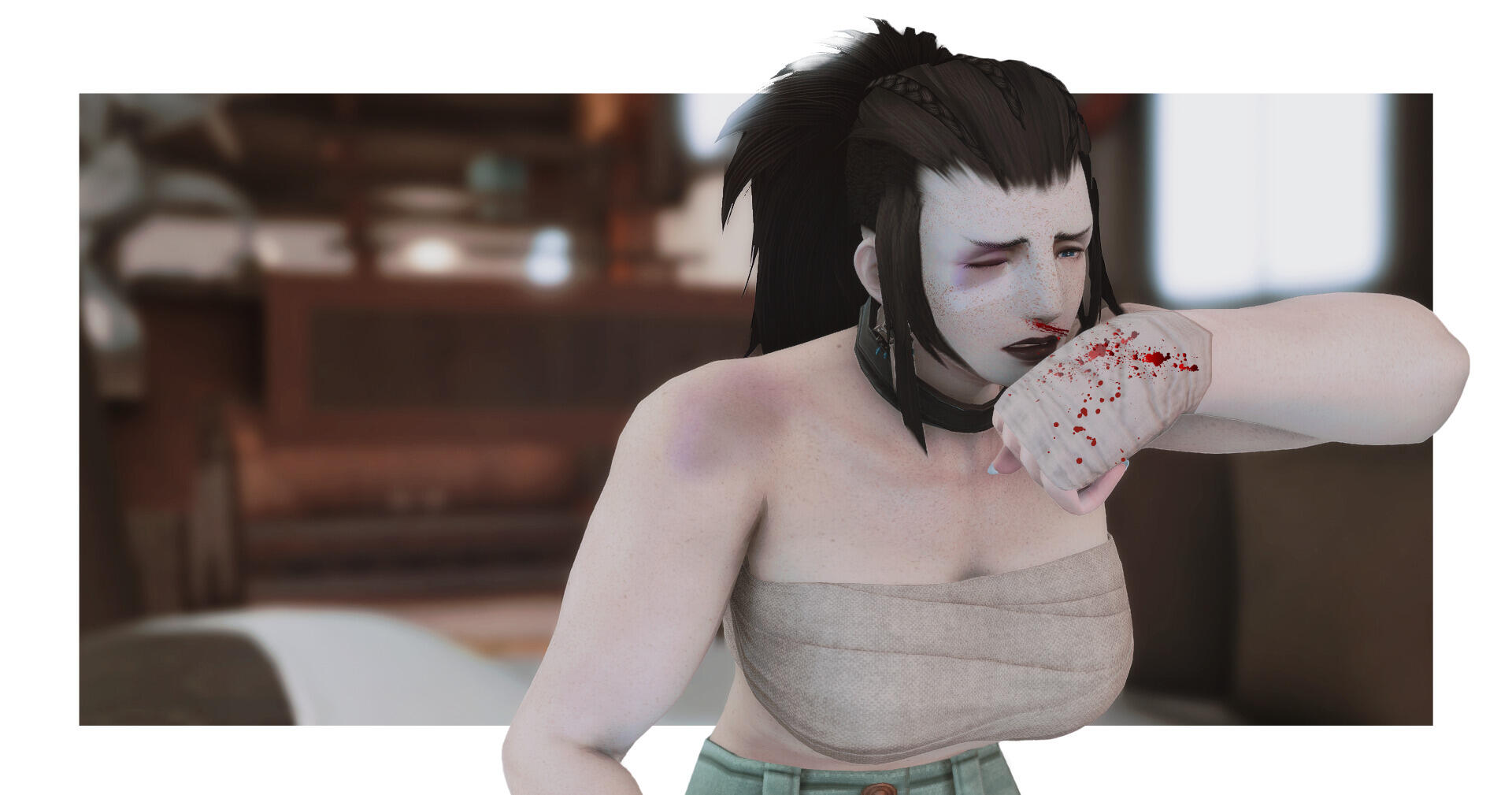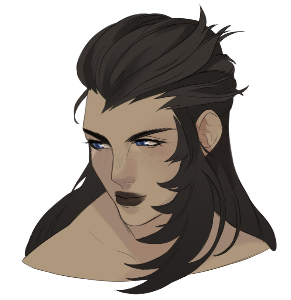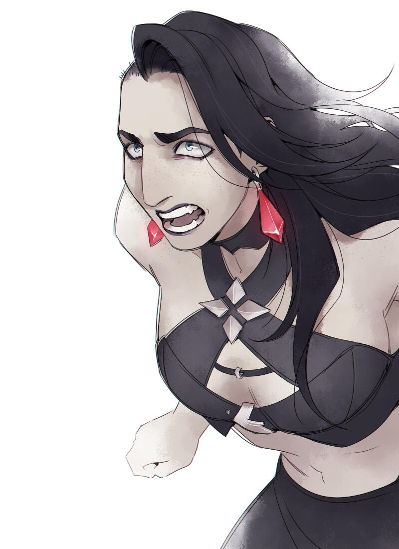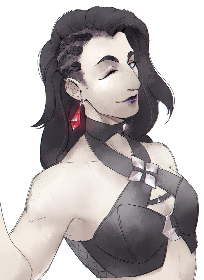 (Pronounced with the "oe" sound as a long “o" similar to “rowboat”.)Nickname MoeAge 32Height 7’ 6Hair Thick, layered and dark as pitch. Moe’s hair is entirely black, and has the signs of being self-maintained through means of scissors or otherwise. She largely keeps it pulled back in braids or a ponytail; this shows off the shaved sides, which are otherwise hidden when her hair is down.Skin & Build Moe is broad shouldered and heavily muscled, with less of an hourglass shape than an inverted triangle. She wouldn’t be described as anything more than pale - unsettlingly so. Moe has the look of polished marble, except for her face and shoulders that are covered in freckles. Decades of paying for aetheric healing has left her unnaturally without scar or blemish, and many signs of aging or weathering are visibly missing.